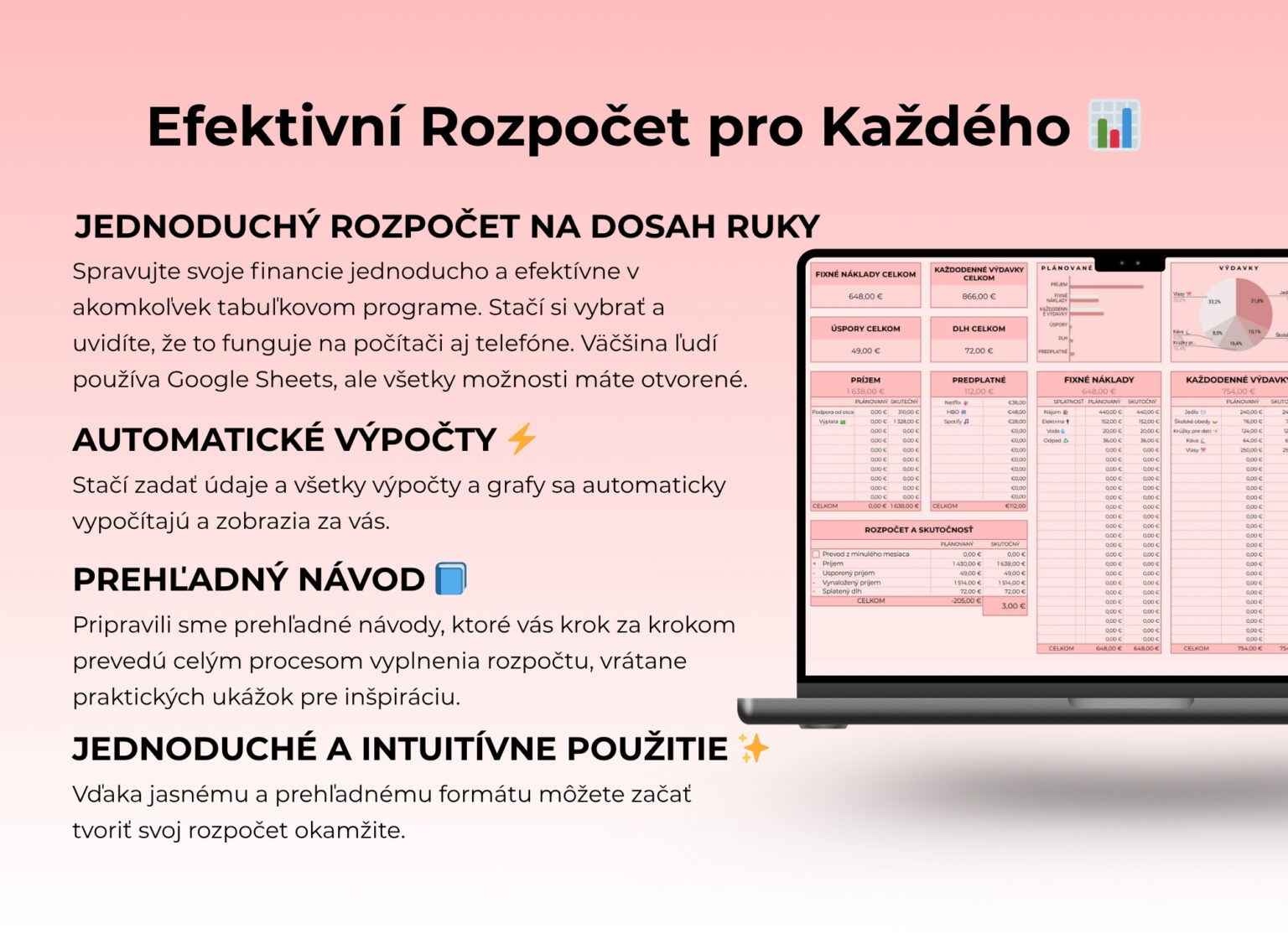 Sadu šablón (rozpočet, prehľad výdavkov, ciele/šetrenie a pod.) + stručné inštrukcie a tipy k používaniu.